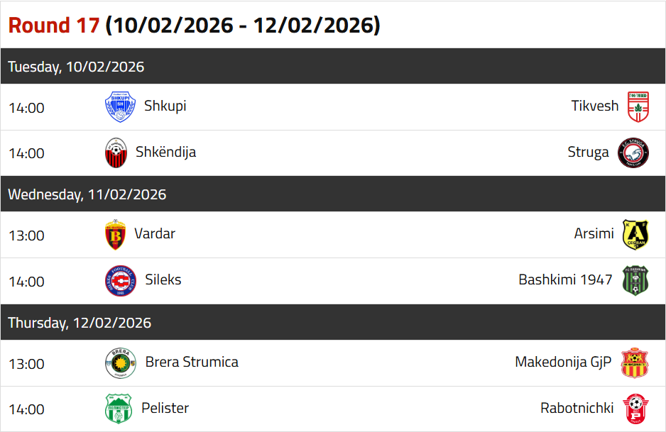 The round continues on Wednesday with another two matches. Vardar hopes to continue the great form from the opening half season with a home win over Arsimi. This match will not be played on Vardar’s home ground but at FFM’s training center, the Field 2 more precisely. Still, Vardar is the favorite despite the fact that Arsimi this season showed that they know how make things difficult for the big teams (they hammered Shkëndija 3:0 in November). However, few days ago Arsimi lost its best goalscorer Shefit Shefiti (11 goals, 2 assists), who transferred to Hatta in the UAE.